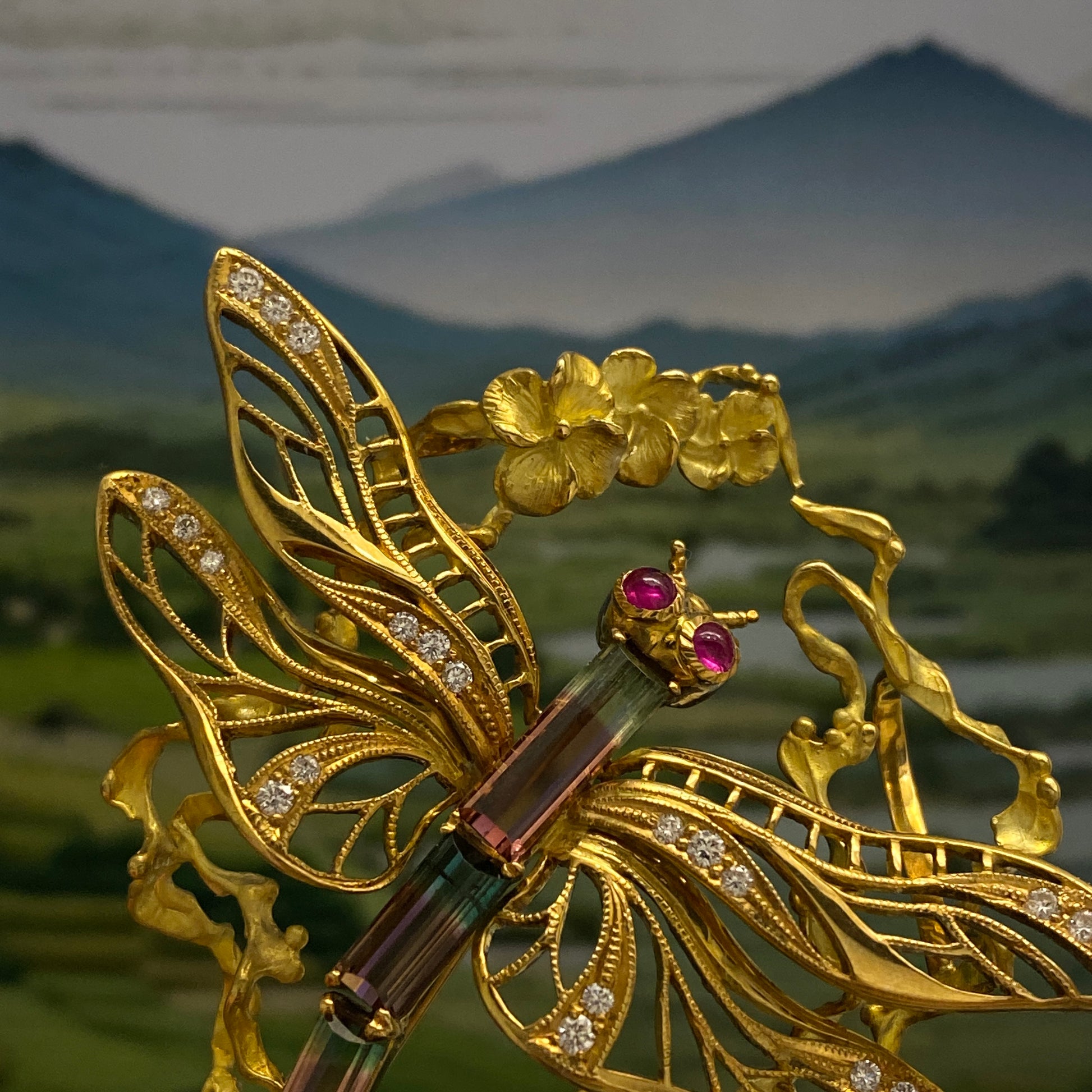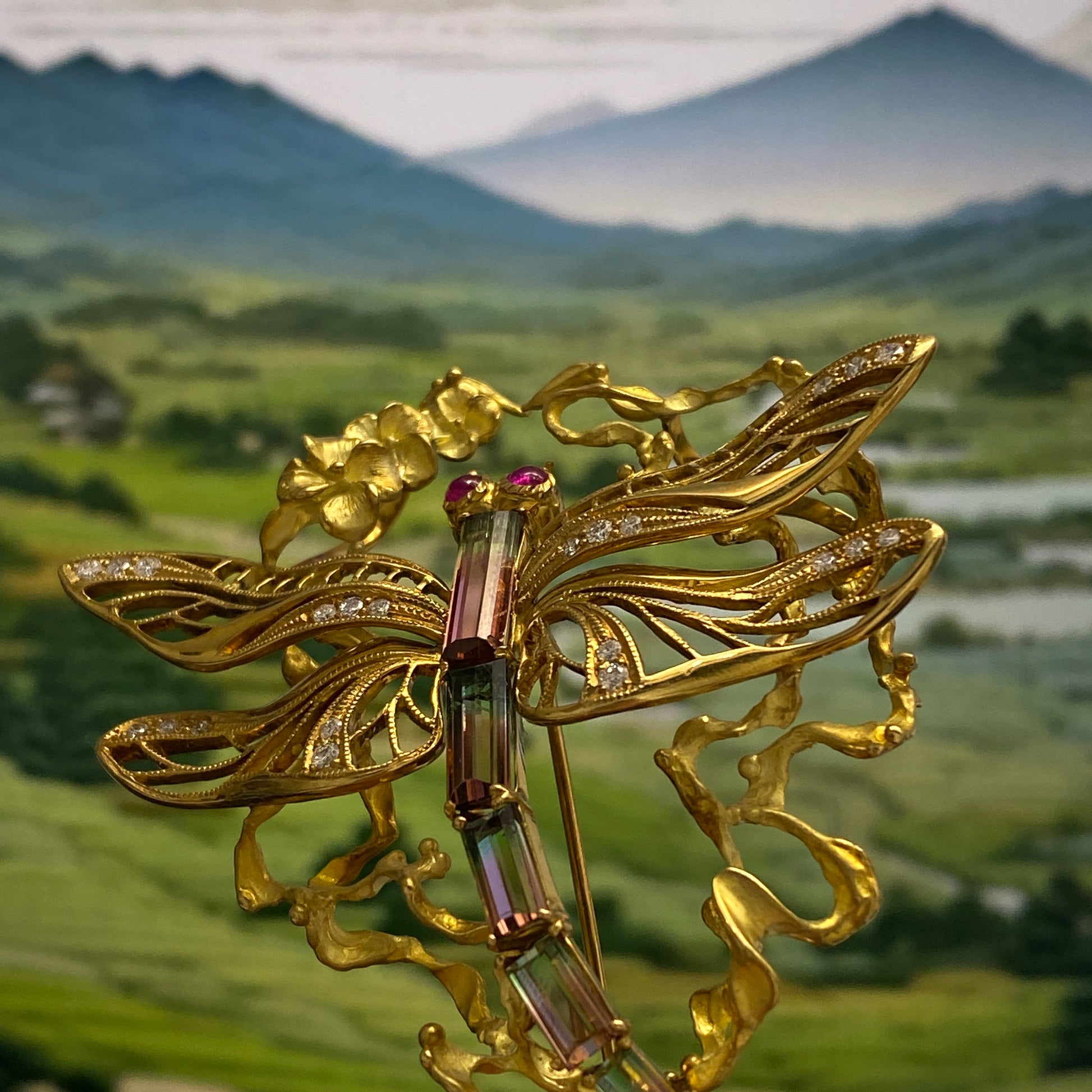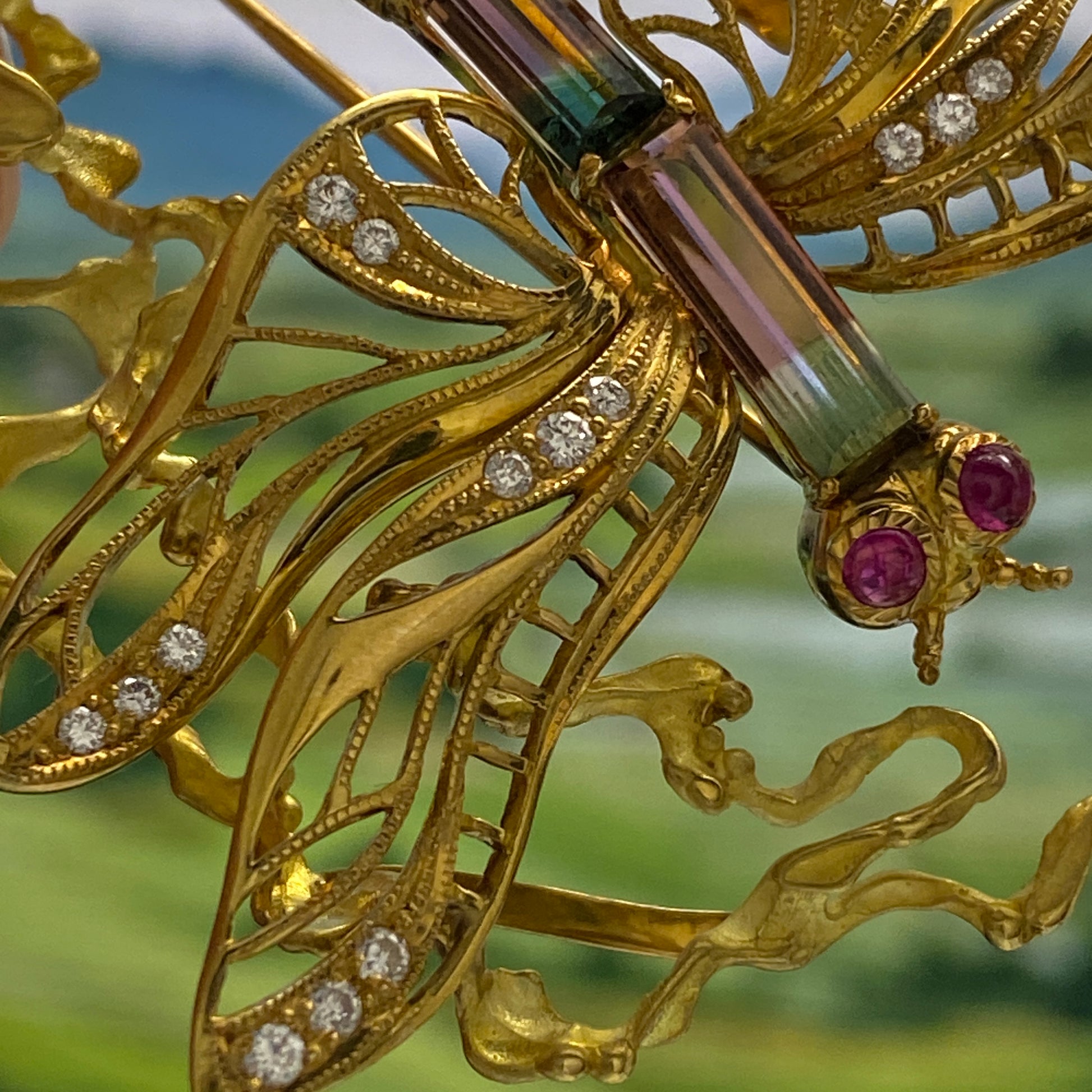 Dragonfly motif Tourmaline Ruby Diamond Brooch
